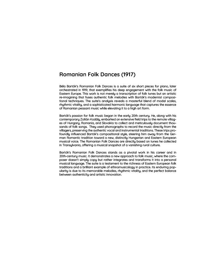 Immerse yourself in the vibrant, rhythmic world of Béla Bartók with this captivating recording of his Six Romanian Folk Dances. Originally composed in 1915 for piano and later orchestrated in 1917, this suite is a brilliant showcase of Bartók's masterful use of folk melodies, which he meticulously collected from Transylvania.
