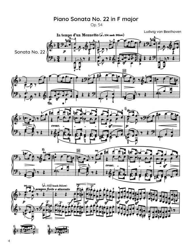 Introducing the Beethoven Piano Sonata No. 22 in F major, Op. 54 – a captivating and often-overlooked gem nestled between the monumental "Waldstein" and "Appassionata" sonatas.