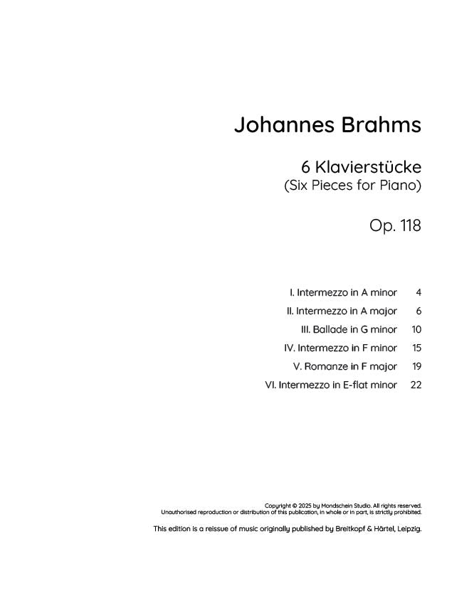 Brahms - Six Pieces for Piano, Op. 118 (PDF Sheet Music / Digital Download)