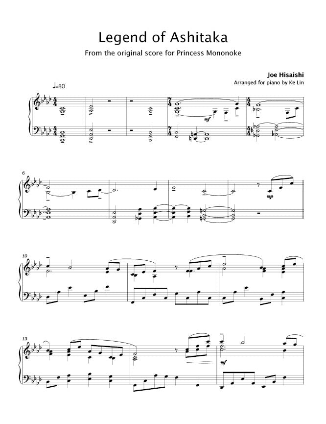 Experience the enchanting beauty of Joe Hisaishi's "Legend of Ashitaka" with this refined and highly accurate piano transcription. Capturing the essence of the beloved Princess Mononoke theme, this edition meticulously translates the orchestral grandeur and delicate melodies for solo piano.
