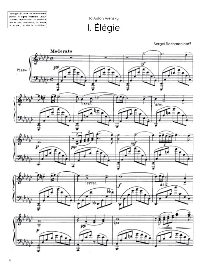 The collection begins with the poignant Élégie in E-flat minor (No. 1), setting a deeply expressive and contemplative tone. This leads directly into the iconic Prélude in C-sharp minor (No. 2), a piece that brought Rachmaninoff international fame almost overnight with its majestic, bell-like chords and powerful intensity. Following this dramatic centerpiece are the lyrical Mélodie in E major (No. 3), a tender "song without words" that highlights his gift for soaring lines.